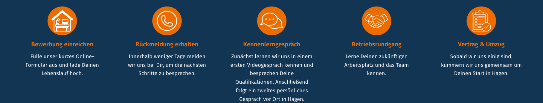 Da unsere Arbeit direkt vor Ort in Hagen stattfindet, ist ein Wohnsitz in der Region erforderlich. Entscheidest du dich für uns, unterstützen wir dich dabei, in Hagen anzukommen: mit praktischer Umzugshilfe und wertvollen Tipps für den Start.